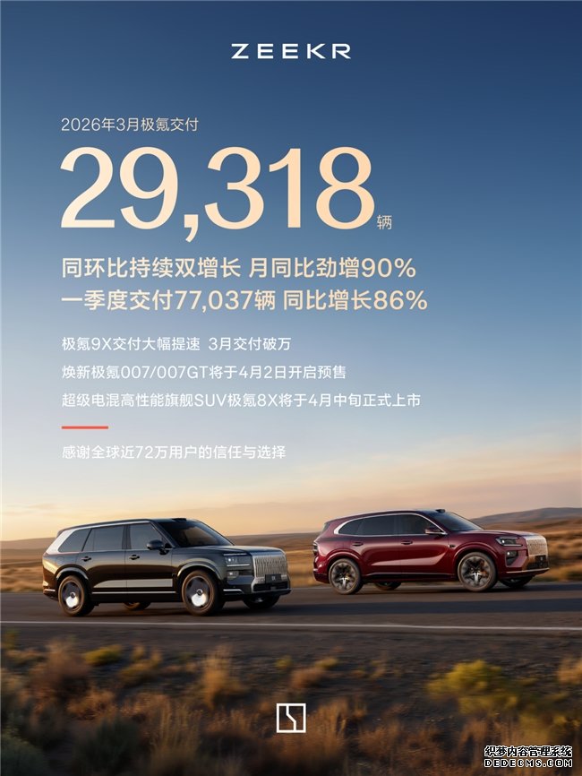 极氪最新交付数据显示,2026年3月交付新车29,318辆,同比增长90%,环比增长23%,成为主流新势力中唯一近两个月连续实现同环比双增长的品牌。今年一季度,极氪累计交付77,037辆,同比提升86%,创下历史同期新高。截至目前,极氪全球累计交付量已逼近72万辆,持续夯实其在高端豪华新能源市场的领先地位。业内普遍认为,极氪一季度交付量实现同环比暴涨,主要得益于极氪9X持续热销、8X预售超预期、猎装家族持续领先等多重因素的共同驱动。